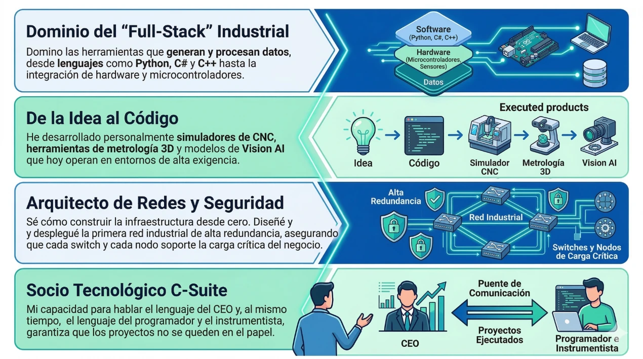 Desplegamos soluciones de Vision AI y Metrología 3D que redujeron los tiempos de inspección en un 80% para componentes críticos, optimizando el OEE y la calidad.